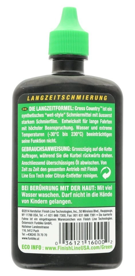Cross Country Kettenöl wird besonders für extreme Fahrbedingungen empfohlen. Die Rezeptur mit hochviskosen Synthetik-Ölen, wasserabweisenden Polymeren und hochwertigen Antiverschleiß-Additiven macht dieses Produkt zum stärksten, dauerhaftesten und wasserfestesten Schmiermittel von Finish Line. Cross Country Kettenöl behält nach dem Auftragen seine nasse Konsistenz und gewährleistet maximalen Leichtlauf, geräuscharme Fahrt und ultimativen Korrosionsschutz unter den härtesten Fahrbedingungen. Wenn Sie dieses Kettenöl für Geländefahrten oder bei trockenem Wetter nutzen, sollten Sie überschüssiges Schmiermittel sorgfältig von Kette und Komponenten abwischen, um das Anziehen von Staub und Sand zu vermeiden. Seit seiner Markteinführung 1994 ist Cross Country Kettenöl das bevorzugte Schmiermittel vieler internationaler Profi-Teams auf der Straße und im Gelände. Verwenden Sie Cross Country Kettenöl insbesondere bei schweren und langen Strecken. Es bietet überragende Performance bei 150+ km Touren, matschig-nassen Geländebedingungen, langen Regenfahrten und salzigem Küstenklima. Ein schwereres, flüssiges Schmiermittel, das etwas mehr Sorgfalt bei der Sauberkeit des Antriebsstrangs benötigt, dafür aber ultimative Schmier- und Schutzeigenschaften liefert.