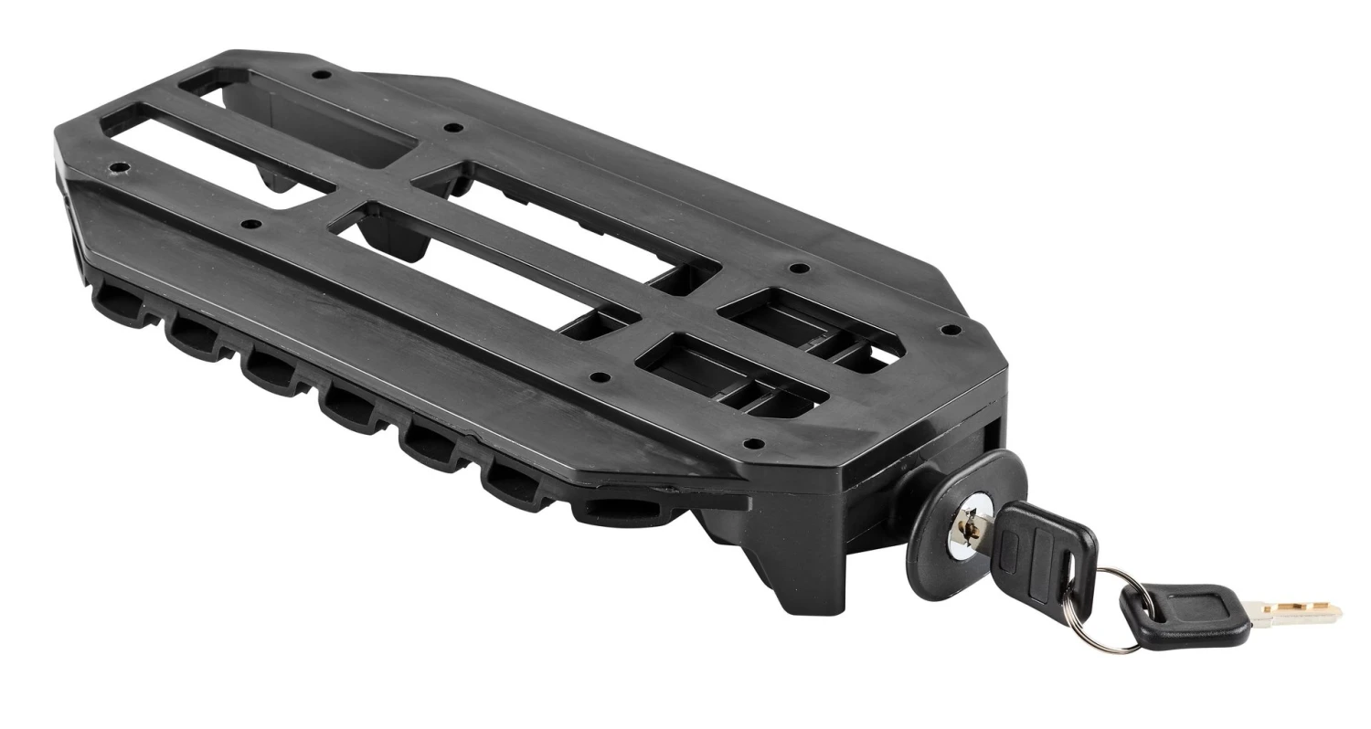 Feinmaschiger Hinterradkorb mit Sattelaussparung und Tragegriff. Unter dem Korbboden ist eine Adapterplatte verschraubt, die mit ihrem abschließbaren Schnappsystem auf den entsprechenden Gepäckträger aufgeklippt wird.