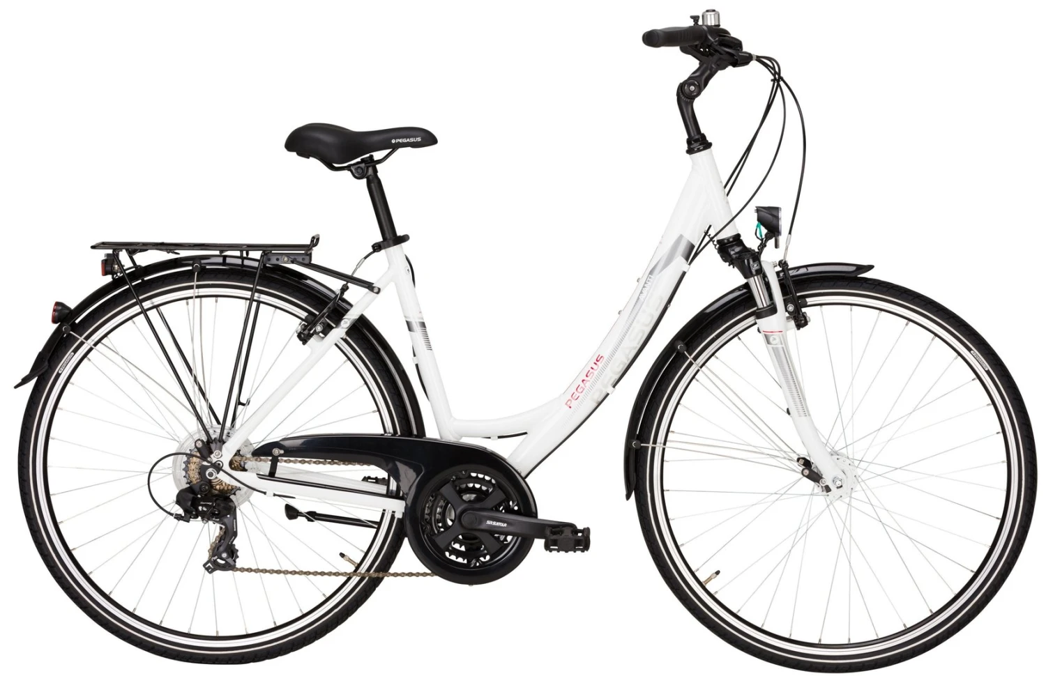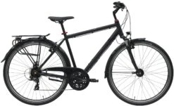 Alu Rahmen, Suntour CR-100 Federgabel, Shimano Tourney 21-Gang Schaltwerk und Umwerfer, Suntour Kurbeln mit gekapseltem Lager, Altus EZ-Fire Schalthebel, Alu V-Bremsen, Hohlkammer-Felgen, verstellbarer Vorbau, Nabendynamo, 15 Lux LED-Lampe, Standrücklicht